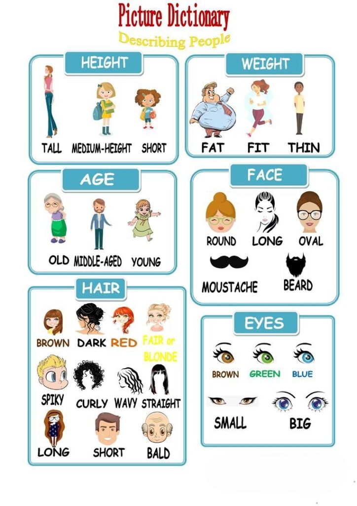 5. This person has long / short / blonde / dark hair and light / dark skin.