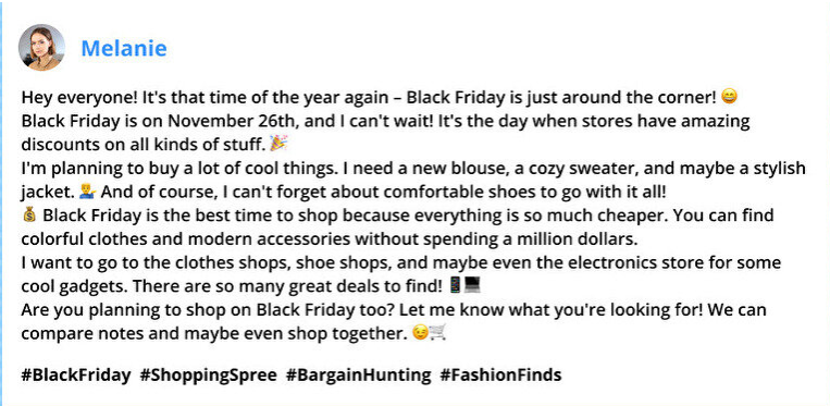 4. Why does Melanie say that Black Friday is the perfect time to shop?