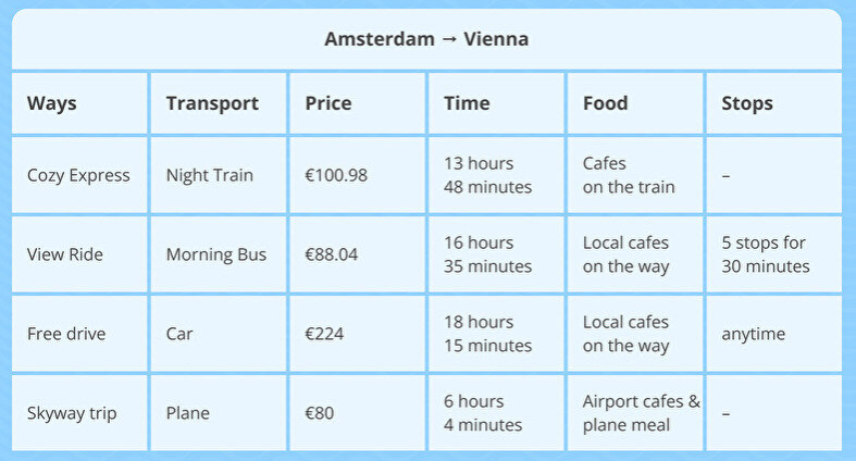 Imagine you want to get to Vienna. Compare the four ways. Choose one that is better for you. Explain why.