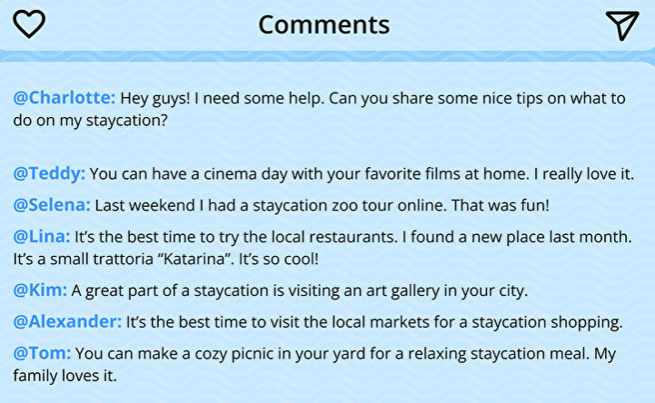 Emma: Alright. That was nice but challenging. The weather wasn’t good all the time. It rained, and the boat moved a lot. So, I didn’t feel well. When we had a stop in one of the towns, I went to the hospital. Anyway, I enjoyed the beautiful view of the ocean and the people. I’d like another trip like that with my new friends.