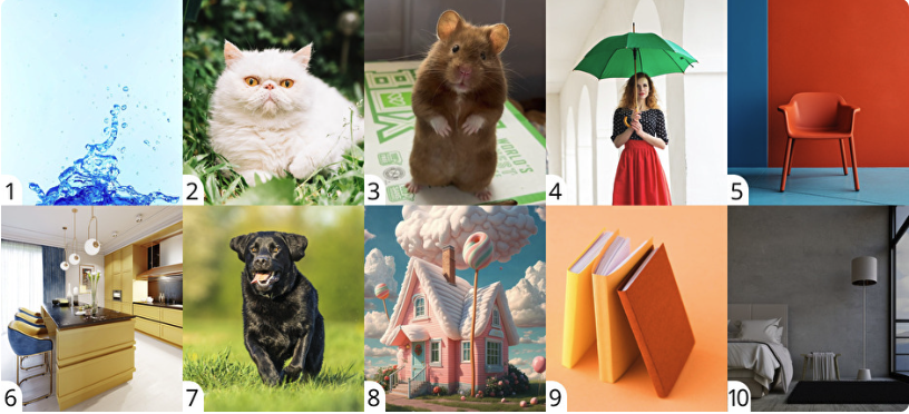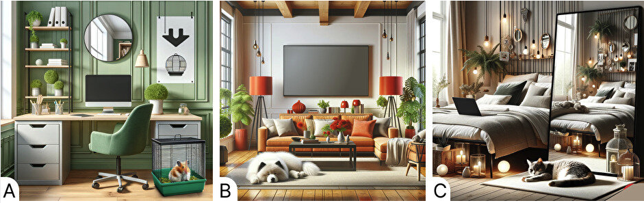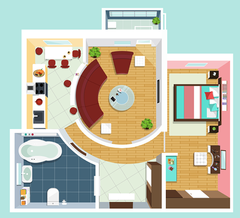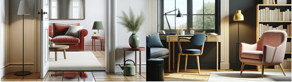 Look at the rooms. Describe every room. Use the names of colours, prepositions and furniture words.