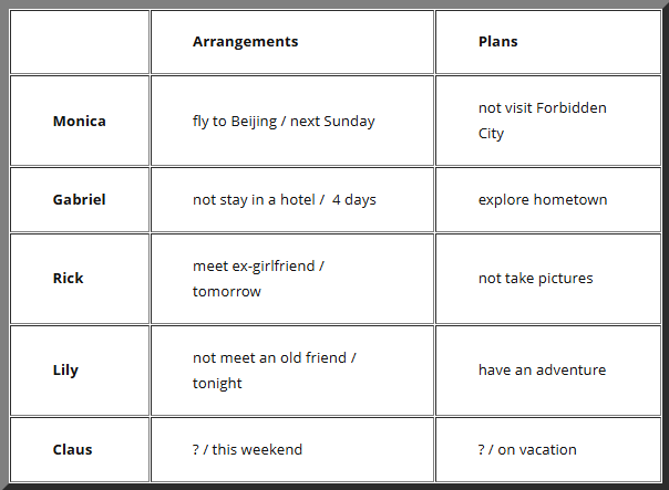 Look at the table and talk about these people’s plans and arrangements. Make questions about the last person