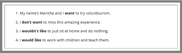 Hey all! My name’s Marisha and I want to try voluntourism. Voluntourism is a combination of volunteering and tourism. Voluntourists usually take part in activities such as teaching in schools, building homes, and working with local organizations. I don’t want to miss this amazing experience. I wouldn’t like to just sit at home and do nothing when there are so many people who need our help. That’s why I am going to Uganda to do my part and make a positive change in the lives of others. I would like to work with children and teach them basic skills like reading, writing, and math. It will be a great chance for me to explore a new culture and do something really important. I know it will be a big challenge, but I’m ready for this adventure!