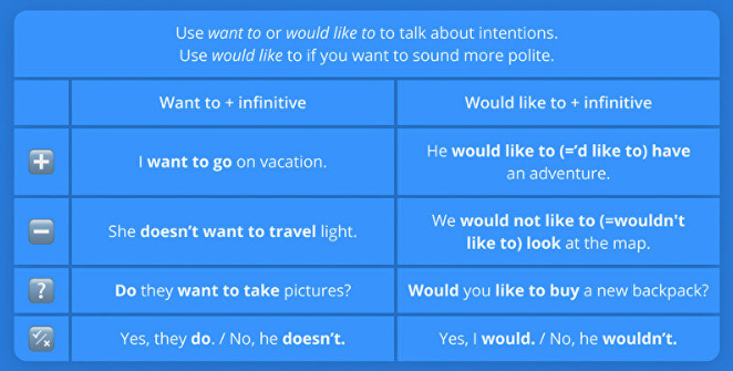 Read the sentences below. What’s the difference between “want” and “would like” ?